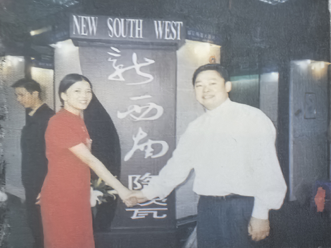 2000年新西南陶瓷江安加盟店開業(yè)。新西南陶瓷公司總經(jīng)理徐素勤(左)與江安店田總握手祝賀。