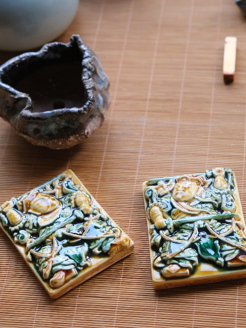 產品巧妙融合了邛窯蜀三彩的獨特工藝和彩繪技術,以浮雕的形式生動呈現秦瓊與尉遲恭的形象。色彩斑斕、層次分明,既展現了古代陶瓷藝術的精湛技藝,又賦予了產品獨特的藝術韻味。