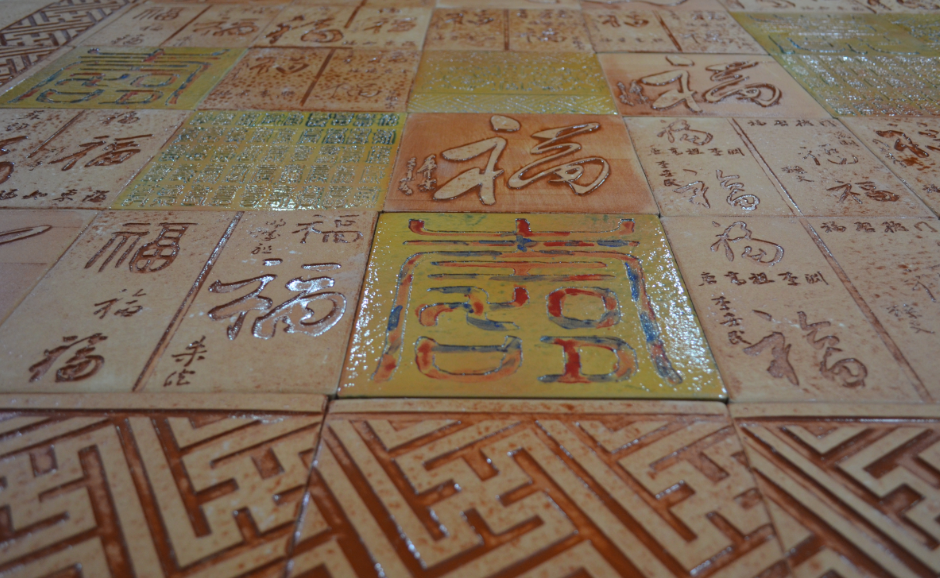 二、雕刻:高精度高速數(shù)控設(shè)備,以0.5mm直徑合金鋼刀具進行線性雕刻,手工修飾,形成凹凸起伏的文字和圖案,并保留刀具偶然出現(xiàn)的線條和點狀肌理,達到每片唯一的個性魅力;