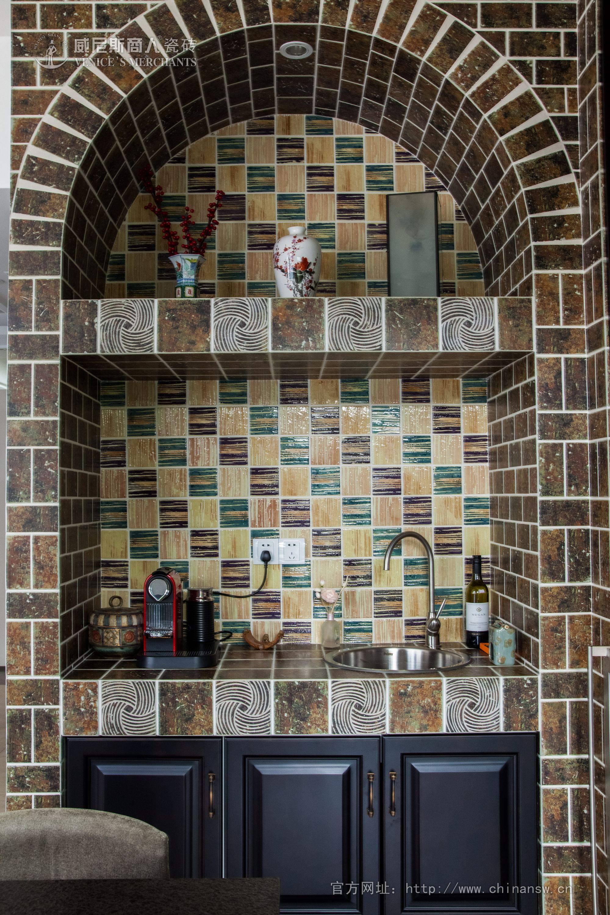 每一片磚上面的顏色都有漸變性、對(duì)比性,宛如高空俯瞰下云貴高原的層層梯田,五彩斑斕;又如晚霞一般,線條彎曲,變化無窮,美不勝收,可以說就是具有五千年中國文化的錦繡河山。藝術(shù)寫意的手法充滿了想象力。
