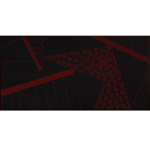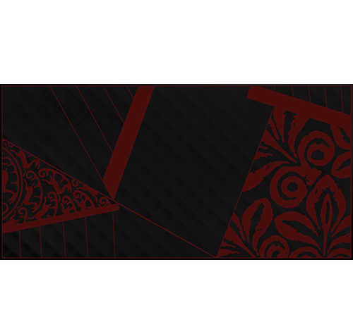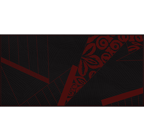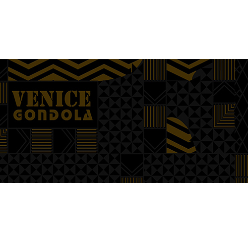 設(shè)計圖案采用平面化構(gòu)成的表現(xiàn)形式,小塊面的三角形、方形組合或分割而成的塊面圖形,是威尼斯蜿蜒的水巷、流動的清波、漂浮在碧波上浪漫的夢……與曲線相對應(yīng)的直線塊面,猶見水上的繁華都市,閃耀的金色似夜景霓虹,打破黑夜的沉悶。