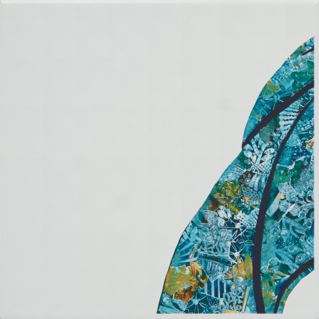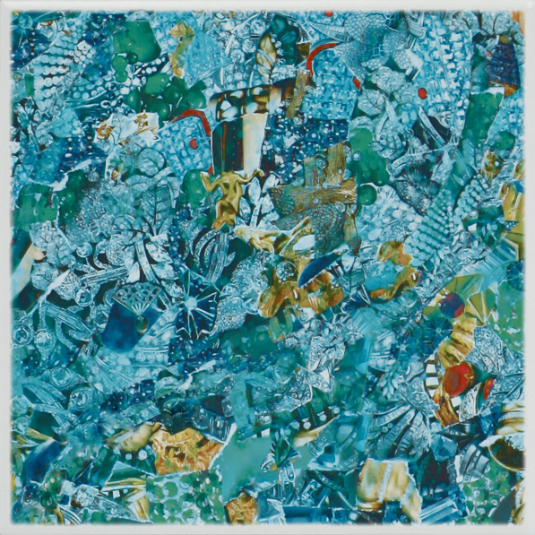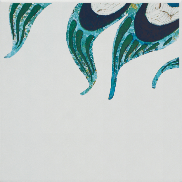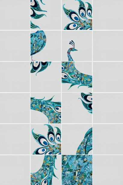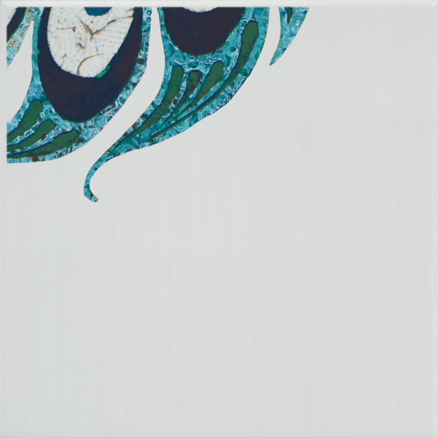 作品采用蒙德里安的色塊構(gòu)成為背景,主體為一只非常漂亮的孔雀,畫面同樣由無數(shù)的碎片拼貼而成,顏色亮麗奪目??兹傅脑匾灾閷毷罪棡橹?,代表其高貴與華麗。背景圖案中有古貼書法、也有現(xiàn)代都市、有西方繪畫、也有民簇瑰寶唐卡畫,給人一種強烈的穿越感,仿佛這只孔雀的美麗歷久彌新,永恒不變。