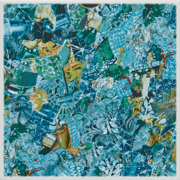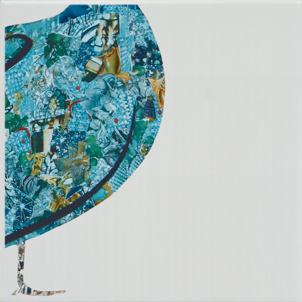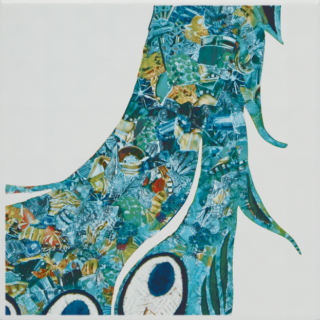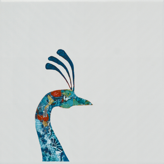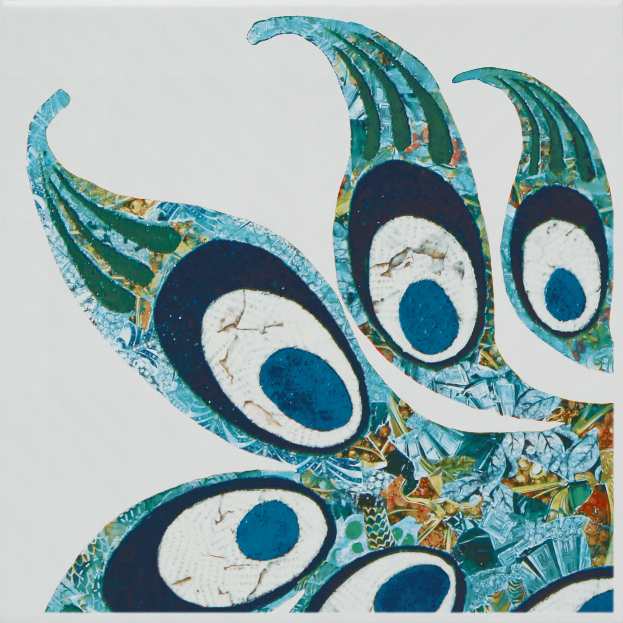 作品采用蒙德里安的色塊構(gòu)成為背景,主體為一只非常漂亮的孔雀,畫面同樣由無數(shù)的碎片拼貼而成,顏色亮麗奪目。孔雀的元素以珠寶首飾為主,代表其高貴與華麗。背景圖案中有古貼書法、也有現(xiàn)代都市、有西方繪畫、也有民簇瑰寶唐卡畫,給人一種強烈的穿越感,仿佛這只孔雀的美麗歷久彌新,永恒不變。