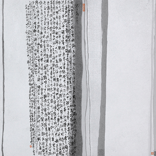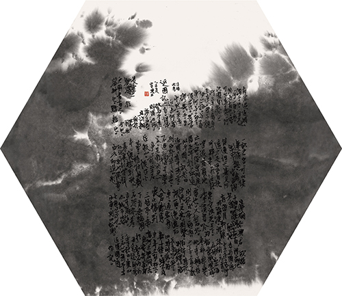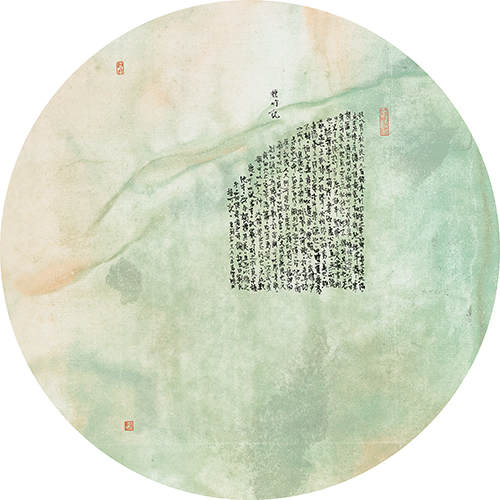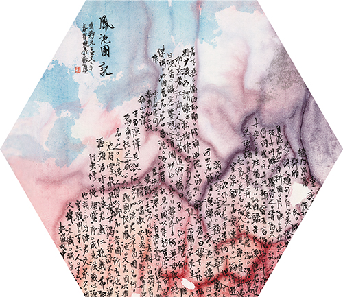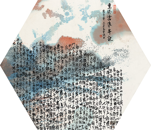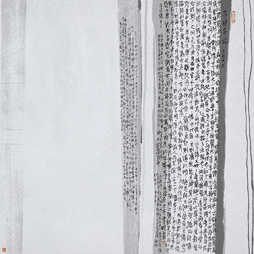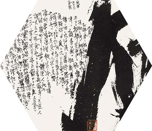 霍曉的書法被稱為“苔蘚體”。有人說,霍曉的“苔蘚體”書法是園林滋養(yǎng)出的。飛白里藏著密密麻麻的小字,是雄渾粗獷的大字下隱藏的清秀小楷。就像夾雜在石縫中生機盎然的青苔?;魰韵壬男】话阒挥?/span>3到5毫米,一粒米上可以寫4個字。但無論如何,這些字體錯落有致,也有足夠的留白。這是有呼吸的空間。